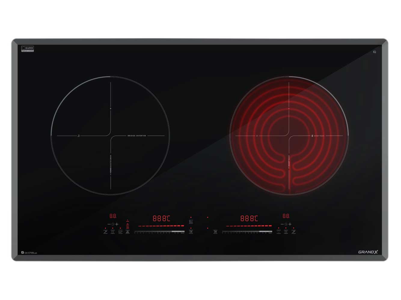 Bếp từ GrandX GX E795Lux Series 7 gây ấn tượng mạnh với thiết kế sang trọng, tinh tế. Mặt kính EURO Platinum vát 4 cạnh không chỉ làm tăng tính thẩm mỹ mà còn giúp bếp có độ bền vượt trội, chống trầy xước và chịu nhiệt tốt.