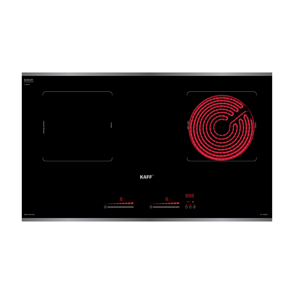 Bếp điện từ KAFF KF-IH202IC - Nhập khẩu nguyên chiếc từ CHLB Đức, có Mặt kính Schott Ceran (Đức) thuộc dòng bếp từ cao cấp của thương hiệu KAFF - thiết bị nhà bếp nổi tiếng tại Đức, là sự kết hợp hoàn hảo giữa 2 bên bếp đều từ sử dụng các bộ nồi chảo inox từ, tiết kiệm điện và đun nấu nhanh hơn, Bếp có thiết kế 2 lò nấu độc lập, kích thước mặt kính 710x420mm, kích thước mặt khoét đá 690x380mm phù hợp với không gian phòng bếp của người châu Á.