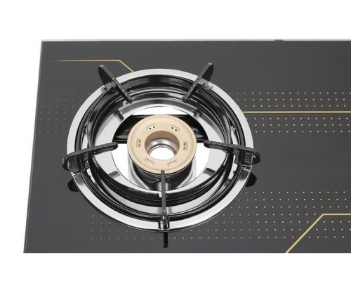 Mặt bếp gas bằng kính màu đen sang trọng, được bao quanh bởi viền inox bền chắc, dễ dàng vệ sinh, cho bếp mới lâu