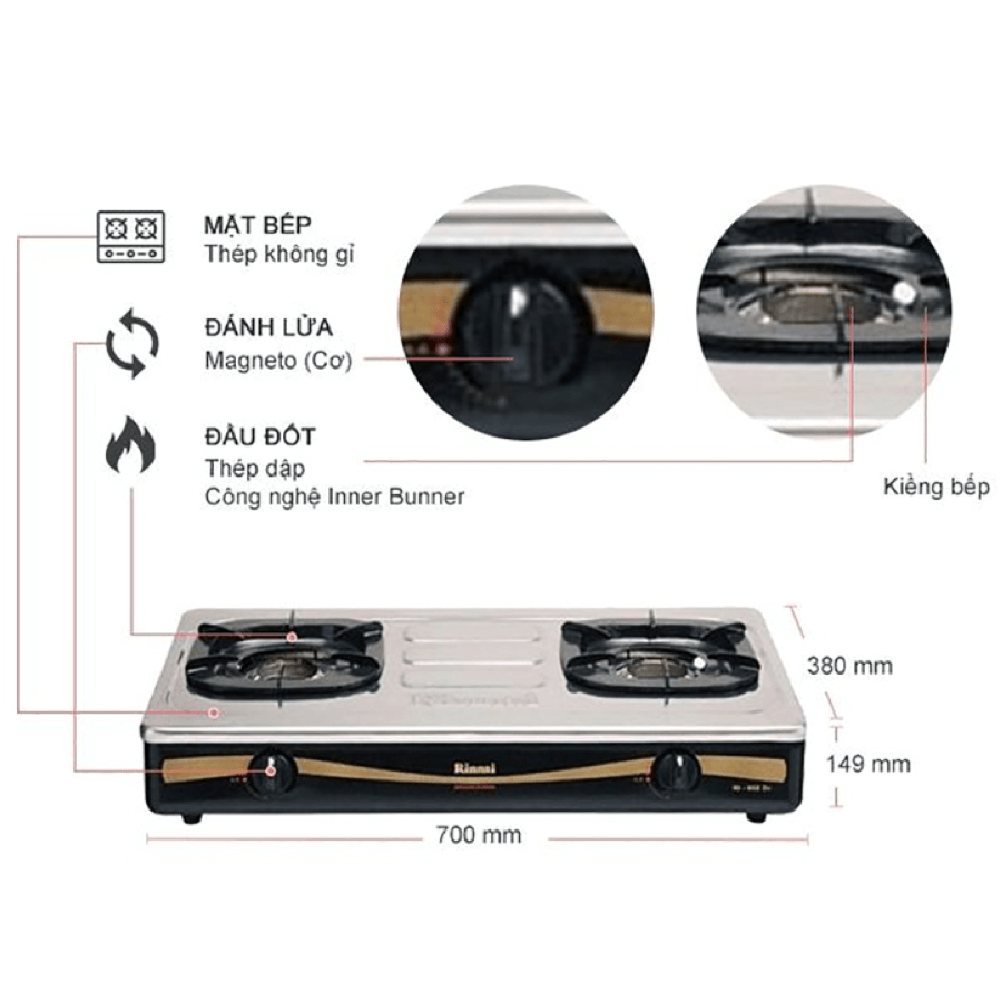 – Mặt bếp bằng thép không gỉ dễ lau chùi – Kiềng bếp phủ men cao cấp chống trượt – Đầu đốt bằng thép dập với bộ chia lửa Inner Bunner |