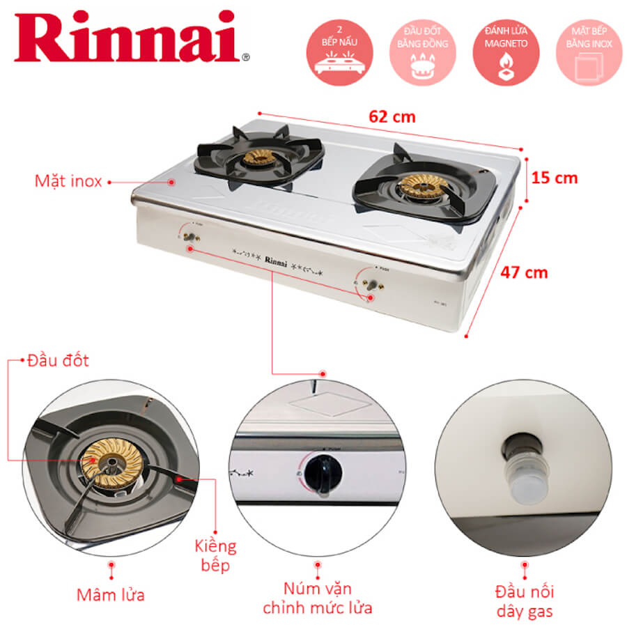 – Bếp gas dương Rinnai RV-365(SW)N có thiết kế với mặt bếp bằng inox cao cấp không gỉ kèm theo đầu đốt bằng đồng thay nguyên khối nên dẫn nhiệt tốt, hệ thống đánh lửa Magneto quen thuộc cũng được nhà sản xuất đưa vào để tiện cho người sử dụng.