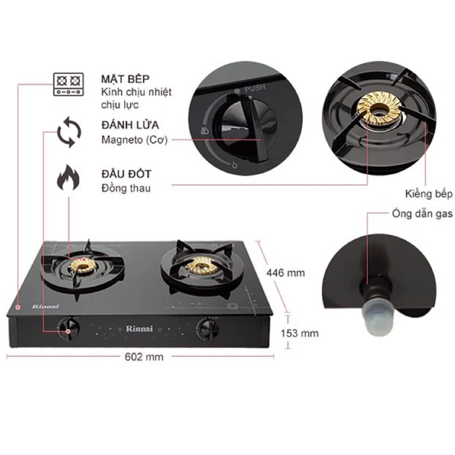 – Khung Bếp gas Rinnai RV-6 DOUBLE GLASS (SP) ,chén đồng nguyên khối mặt kính cường lực cao 135mm rất chắc chắn nâng đỡ các loại nồi chảo có trọng lượng lớn hhi đun nấu