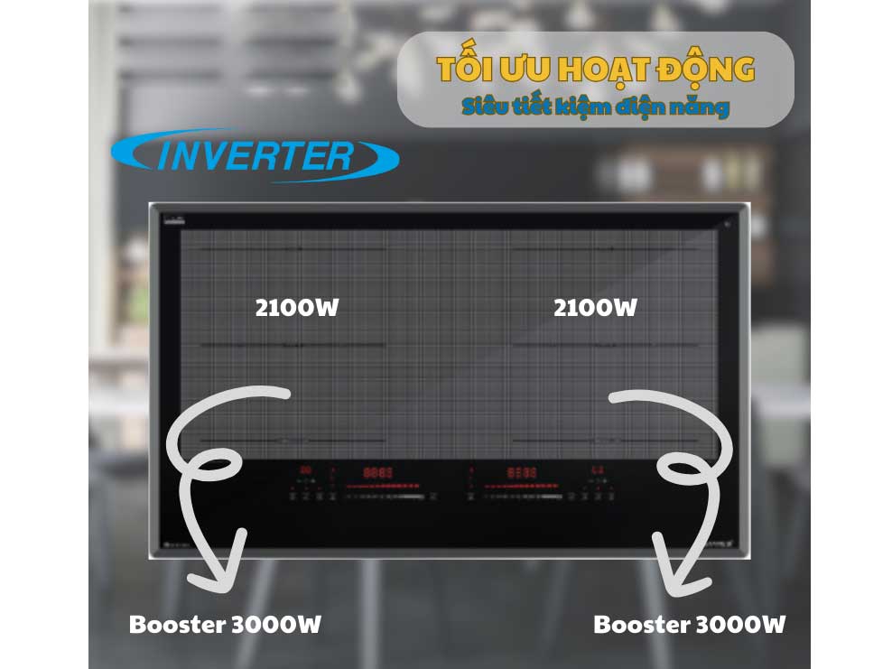 - Công suất lò trái và phải lên đến 2.100W, Booster đạt 3.000W giúp nấu ăn nhanh chóng.