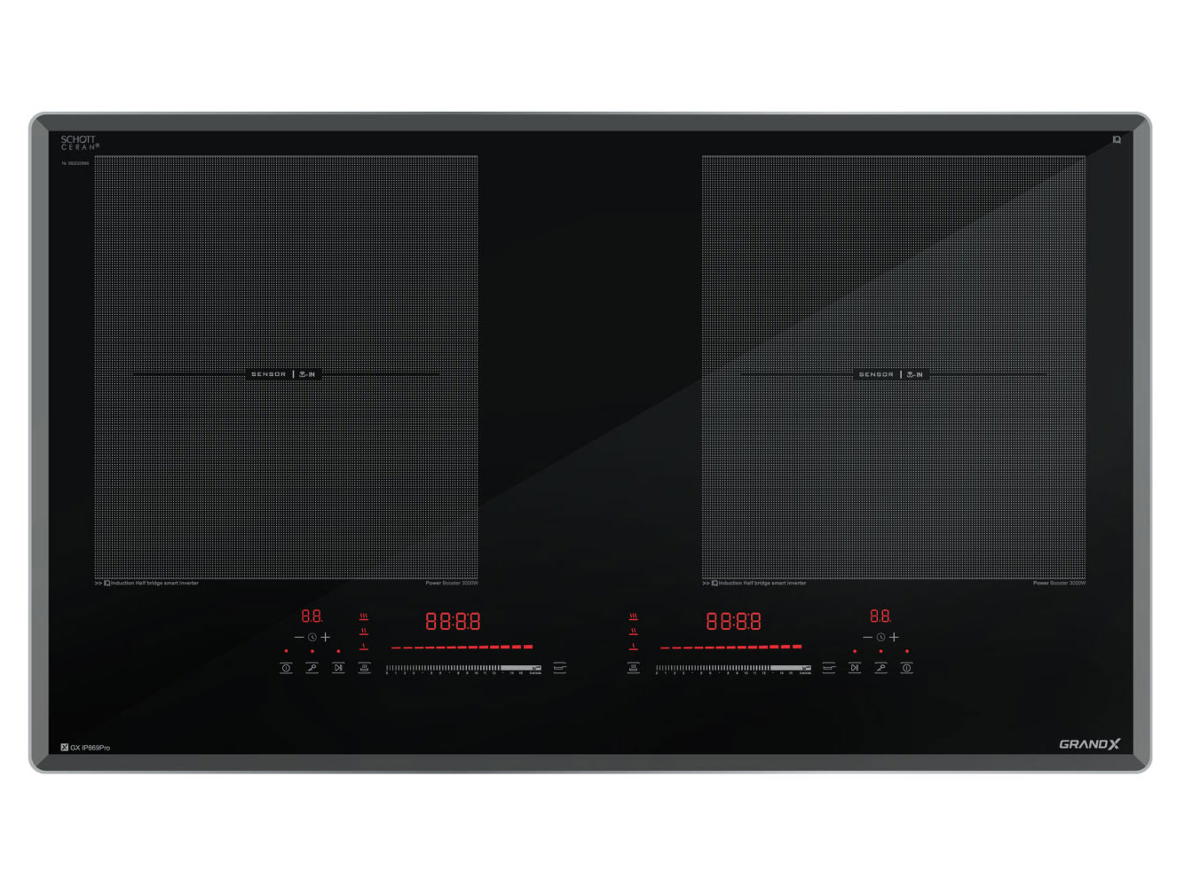Bếp từ GrandX GX IH869Pro Serie 8 không chỉ là một thiết bị nấu ăn mà còn là món đồ trang trí sang trọng cho không gian bếp hiện đại. Mặt kính Schott Ceran nhập khẩu từ Đức có khả năng chịu nhiệt, chịu lực và chống trầy xước tốt, giúp bếp luôn mới và dễ dàng vệ sinh.