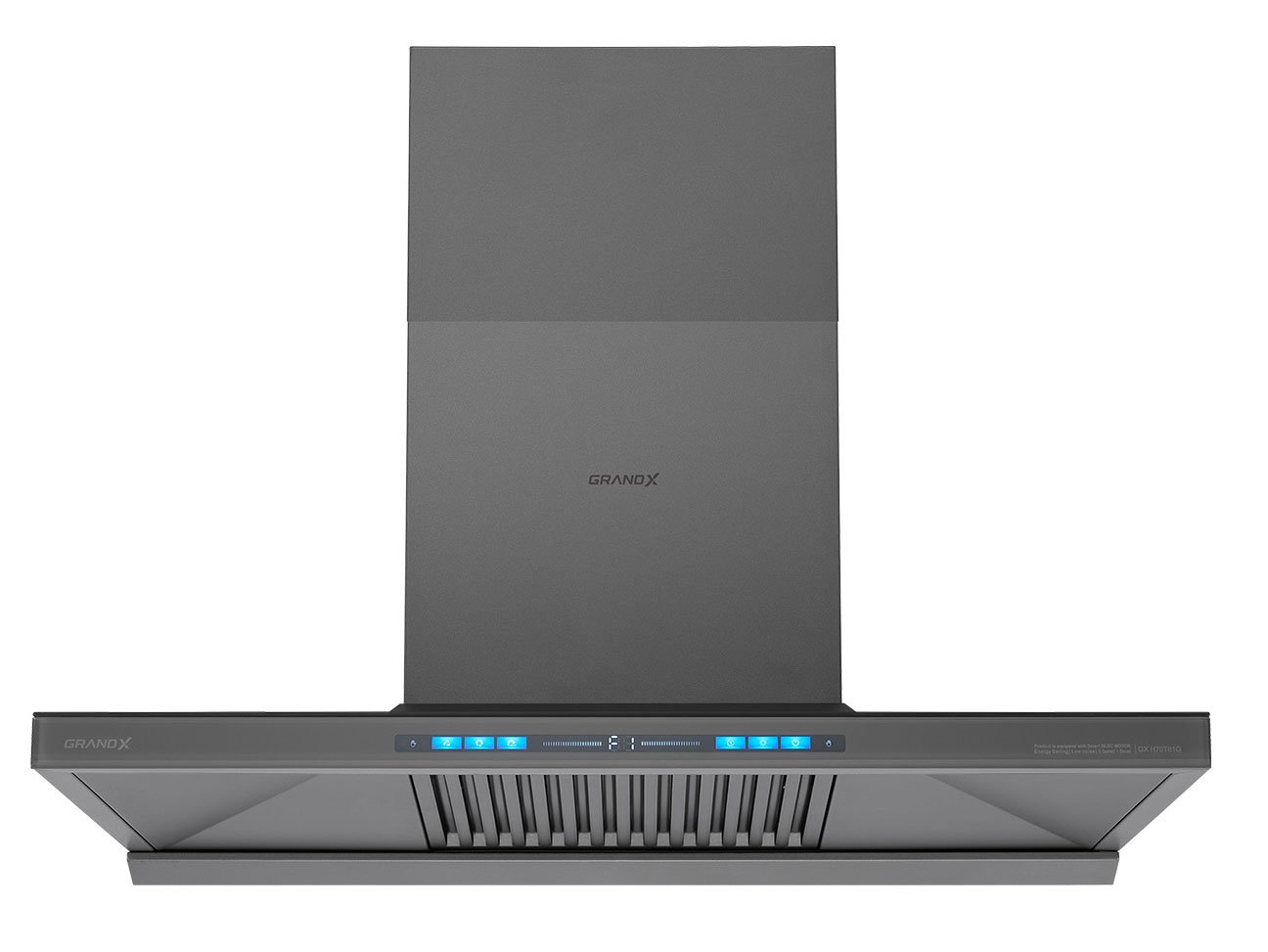 GrandX GX H70T81G gây ấn tượng ngay từ cái nhìn đầu tiên nhờ kiểu dáng hình chữ T (T-Shaped) mạnh mẽ và tinh tế. Kính cường lực dày 6mm được vát 3 cạnh nghiêng độc đáo không chỉ tạo nên điểm nhấn phá cách mà còn giúp người dùng dễ dàng vệ sinh. Toàn bộ thân máy được phủ màu xám Titan sang trọng, kết hợp hoàn hảo với mặt kính, tạo nên tổng thể hài hòa và đẳng cấp cho không gian bếp hiện đại.