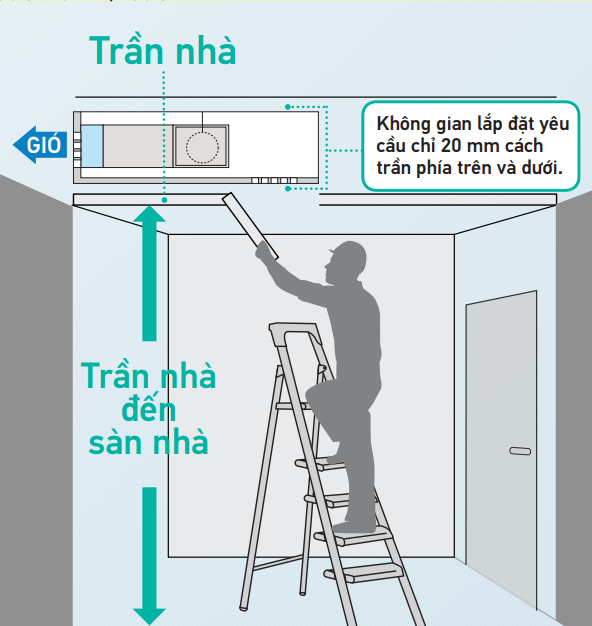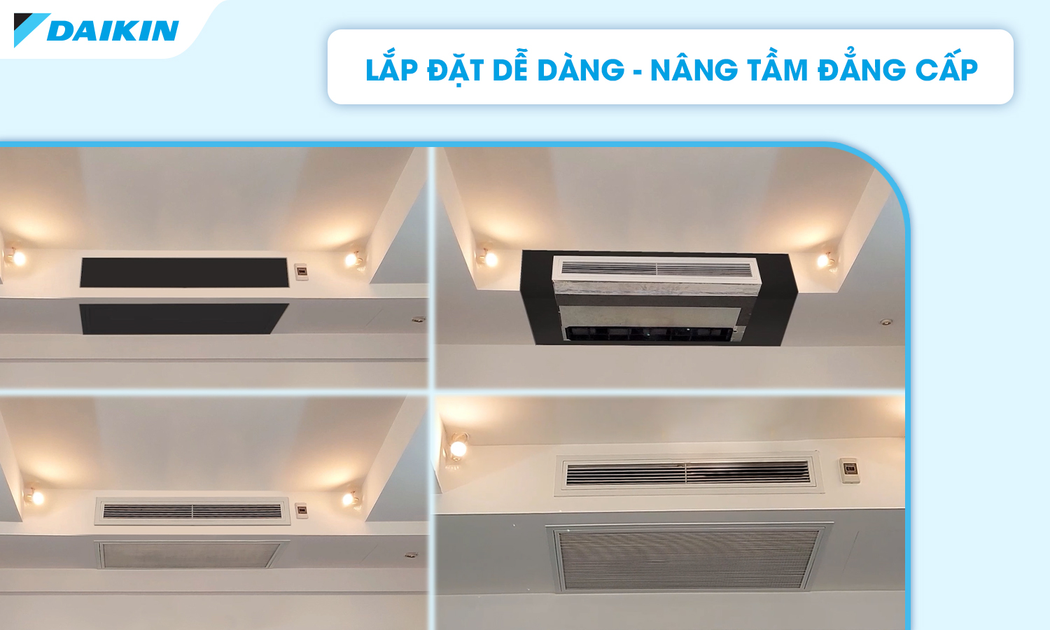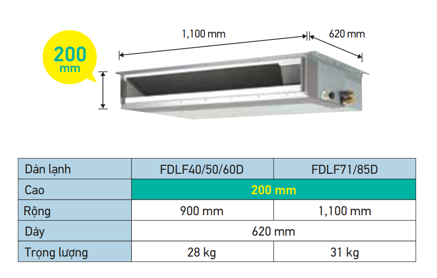 Tất cả các dòng có chiều cao 200 mm cần không gian chỉ 240 mm từ vị trí trần treo và phần trần nhà trống. Với những kích thước nhỏ gọn này, bất kỳ dàn lạnh nào cũng có thể dễ dàng lắp đặt trên các trần nhà hẹp. Loại dàn lạnh nối ống gió mỏng có thể được giấu bên trong trần nhà giúp không gian bên ngoài gọn gàng. Việc lắp đặt này thích hợp cho các phòng khách với trần nhà thấp hoặc không gian nội thất cần giấu dàn lạnh. Các dòng FDLF có chiều rộng 900 mm và 1,100 mm và giúp cho các dàn lạnh này trở nên lý tưởng trong các không gian hẹp.