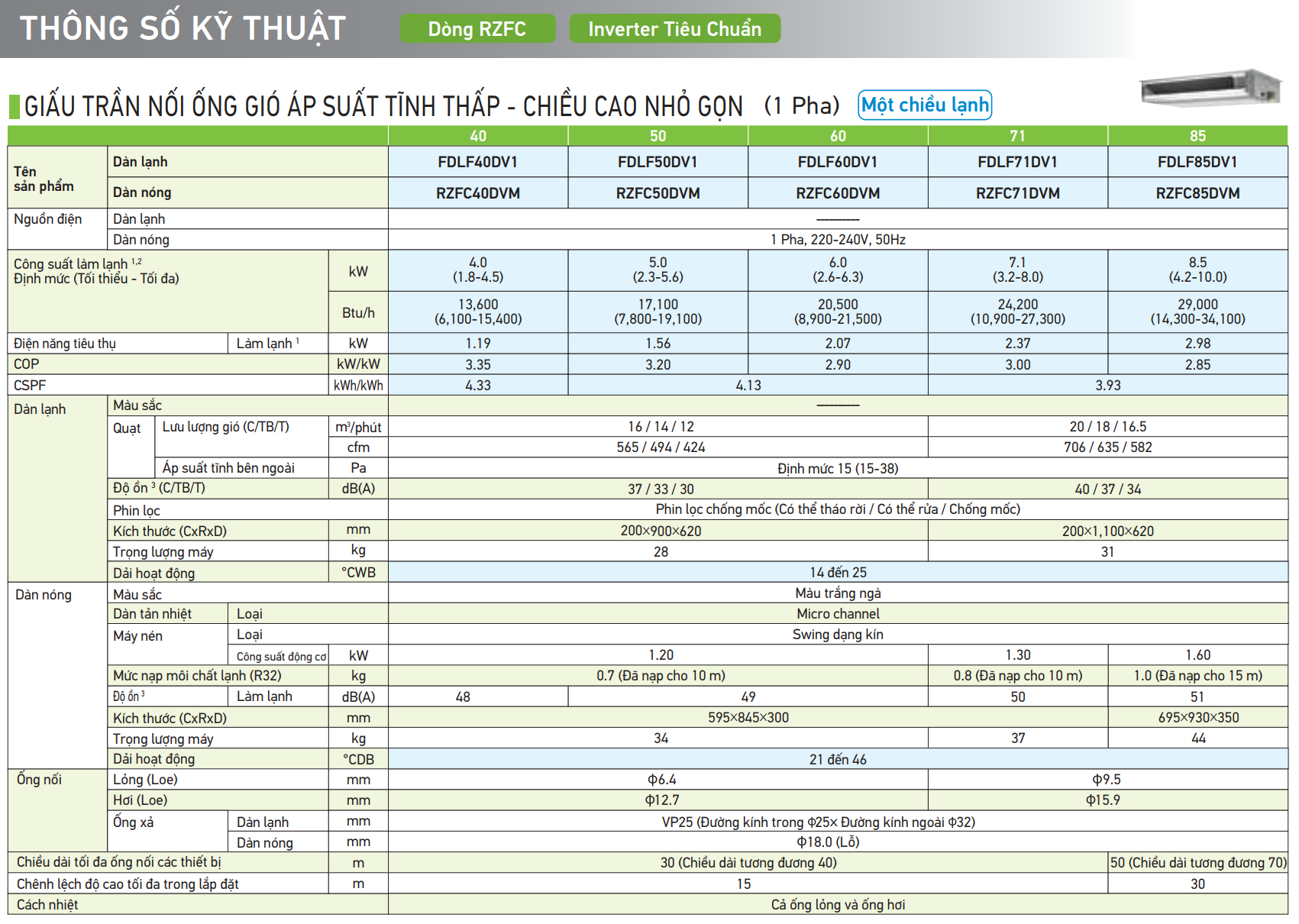 THÔNG SỐ KỸ THUẬT MÁY LẠNH GIẤU TRẦN NỐI ỐNG GIÓ ÁP SUẤT TĨNH THẤP CHIỀU CAO NHỎ GỌN INVERTER DAIKIN FDLF_DV1