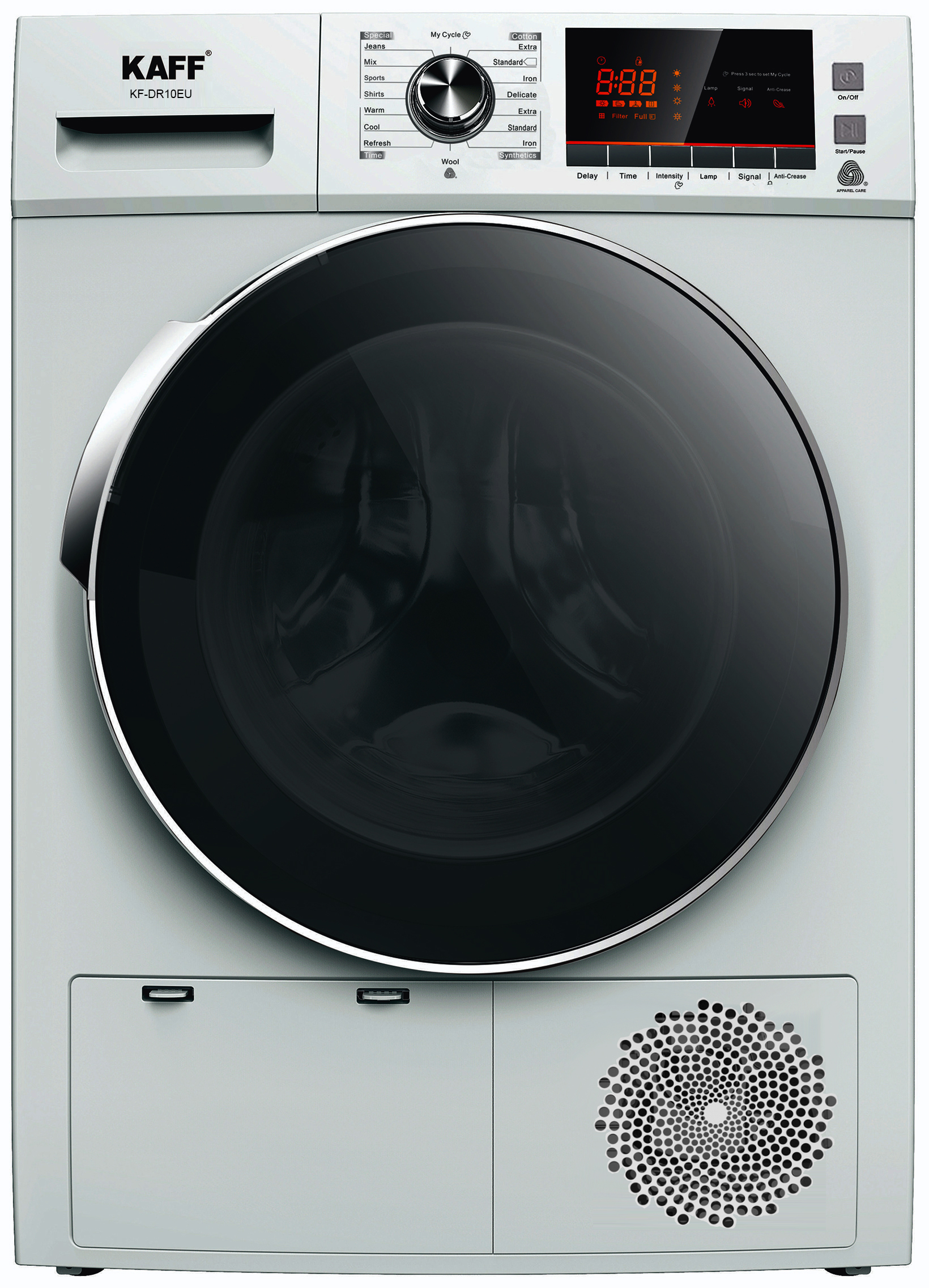 Máy sấy Kaff KF-DR10EU thiết kế hiện đại, sang trọng, có kích thước bằng máy giặt lồng ngang. Trang bị bảng điều khiển phím bấm điện tử và núm cơ với 16 chương trình sấy bao gồm: Cotton (Extra, Standard, Iron) | Synthetics (Extra, Standard) | Delicate | Mix | Special (Sports, Jeans, Bed Linen, Shirts) | MyCycle | Wool | TimeProgram (Warm, Cool, Refresh)
