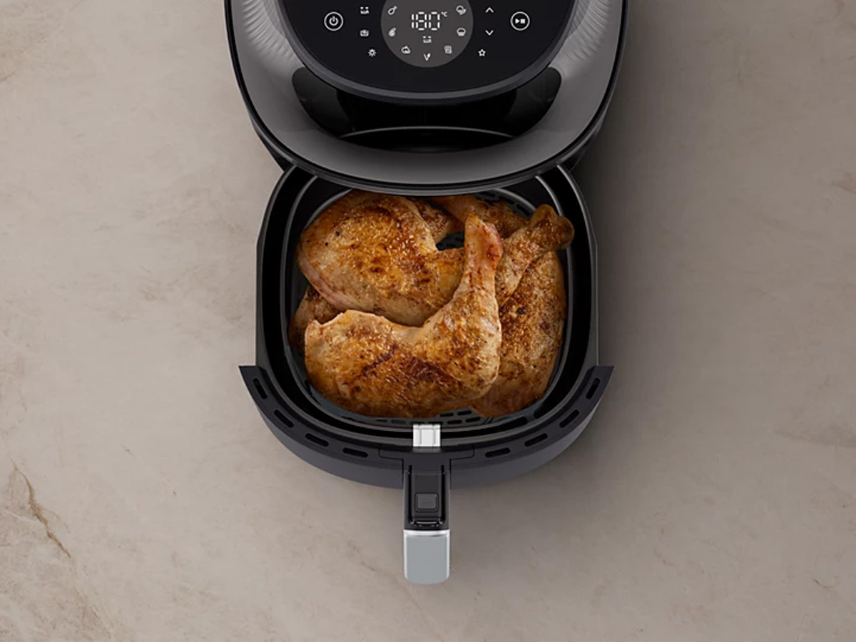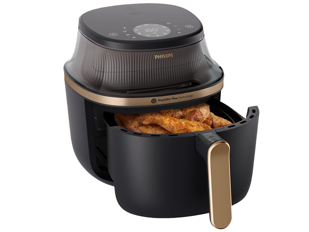 Công nghệ RapidAir Plus của Philips giúp không khí nóng được phân bổ đều khắp nồi, đảm bảo thực phẩm chín đều cả trong lẫn ngoài, đồng thời giảm thiểu lượng dầu mỡ tới 90%. Nhờ vậy, các món ăn không chỉ ngon mà còn ít calo, phù hợp cho những người ăn kiêng hoặc muốn duy trì chế độ ăn lành mạnh.