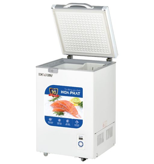 Tủ đông Hòa Phát sở hữu kiểu dáng nhỏ gọn, chỉ nặng 30kg, có 4 bánh xe di chuyển, tiết kiệm không gian.